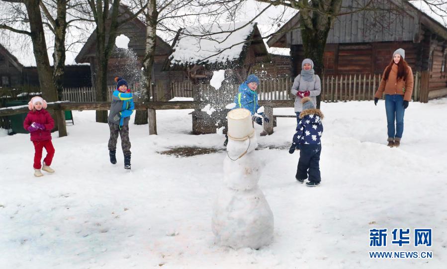 1月24日,孩子們?cè)诎锥砹_斯首都明斯克郊區(qū)的民族建筑博物館內(nèi)打雪仗。新華社發(fā)(任科夫攝)