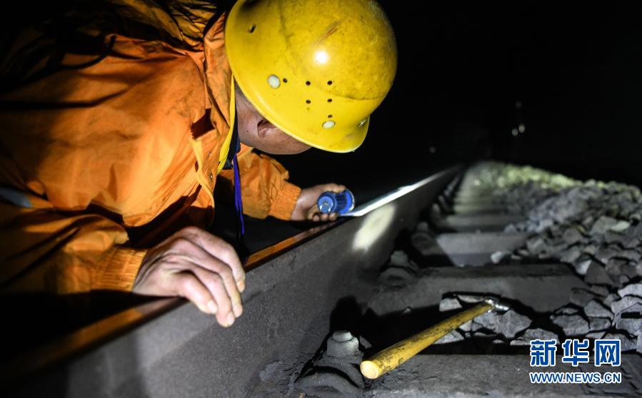 在廣西河池境內黔桂鐵路線上的鄧山隧道,中國鐵路南寧局集團有限公司柳州工務段的4名看守工輪換值班,依靠手電筒在黑暗中穿行,及時巡查隧道中可能出現的各種隱患,確保每天經隧道運行的59趟客貨列車春運安全。鄧山隧道全長773米,是一個需要人員全天候看守的鐵路隧道。