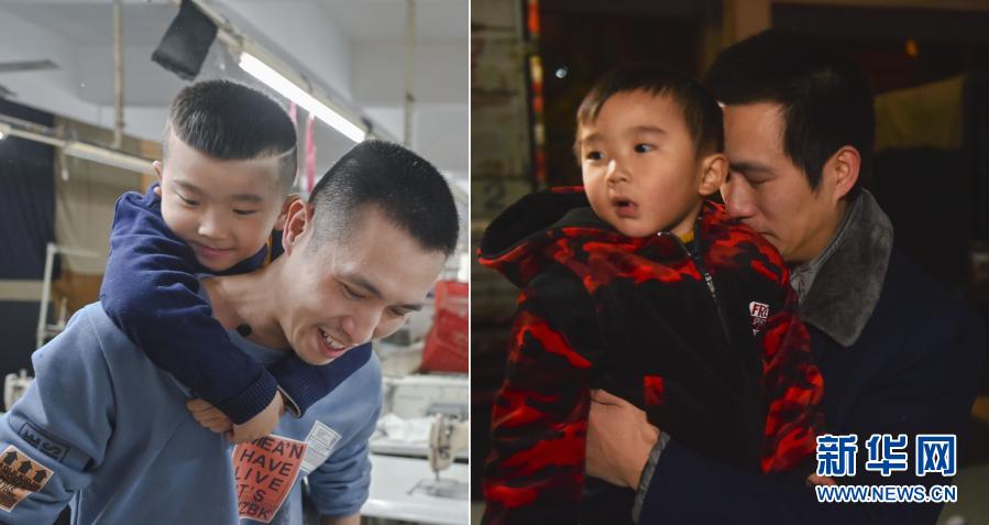 拼版照片:左圖為2021年1月26日,在福建省石獅市的金利萊斯服裝廠(chǎng),聰聰和黃海龍?jiān)谝黄穑挥覉D為2018年2月2日凌晨,黃海龍即將登上返回四川的長(zhǎng)途車(chē),在上車(chē)前抱著不滿(mǎn)3歲的聰聰難舍難分。