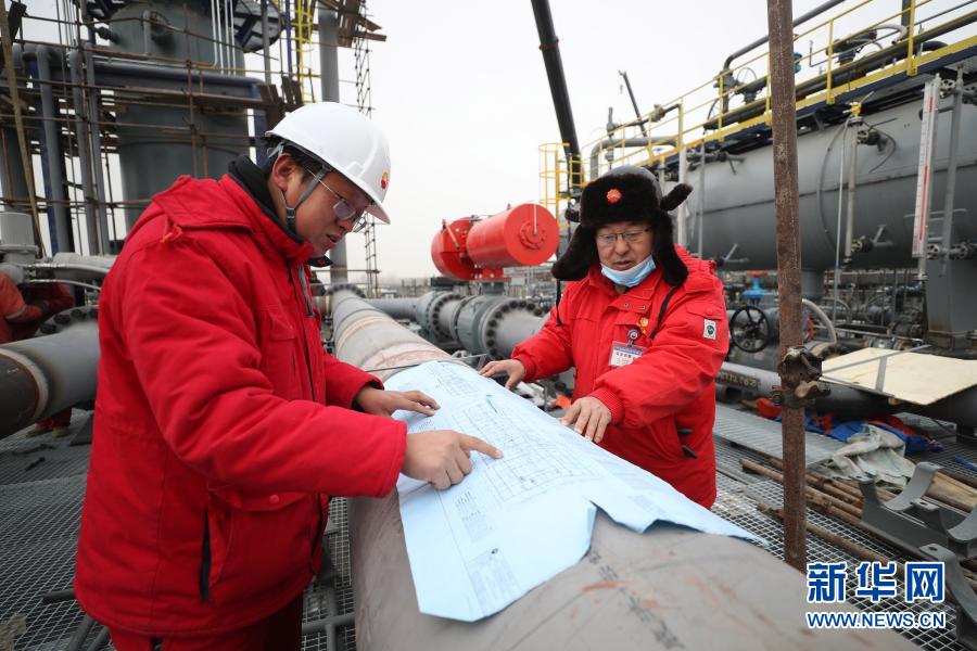 2月3日,在遼河油田雙臺子儲氣庫群一期工程現(xiàn)場,來自湖北孝感的工程技術(shù)人員劉單明(左)和同事在現(xiàn)場工作。今年他留在施工現(xiàn)場過年,確保工期目標(biāo)如期完成。