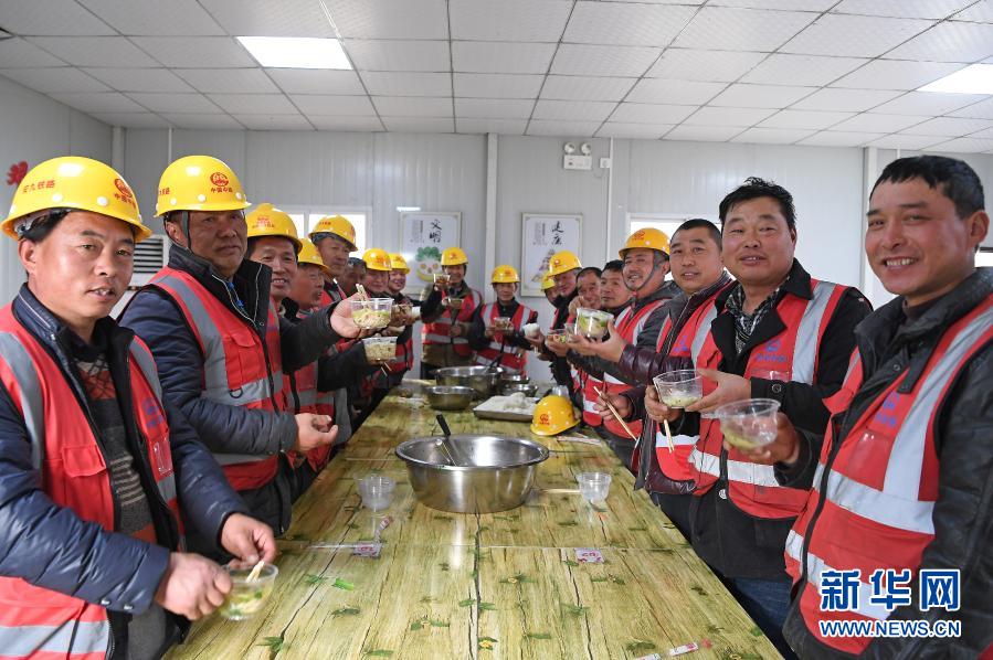 中鐵四局建筑工人們?cè)诎簿鸥哞F江西段長江特大橋工地食堂聚餐(2月4日攝)。