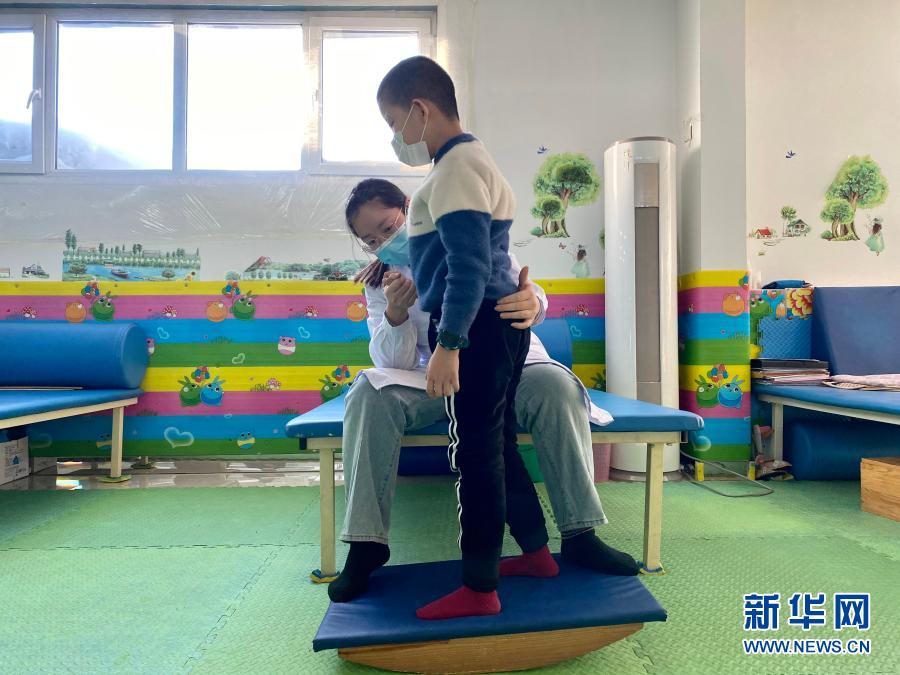 在哈爾濱博能中醫(yī)門診部,劉雨晴為腦癱兒童進(jìn)行康復(fù)訓(xùn)練(2月2日攝,手機照片)。