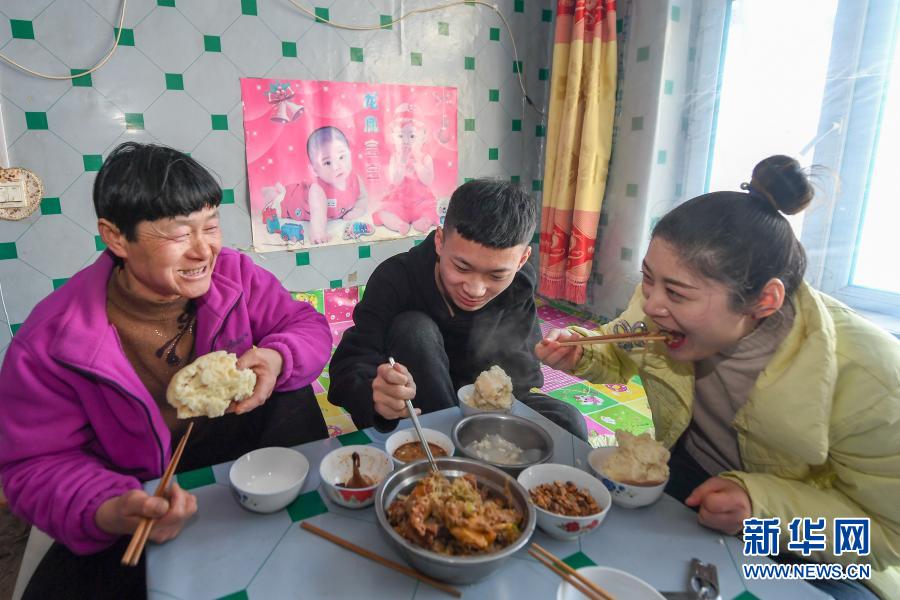 2月9日,在吉林省長春市農(nóng)安縣楊樹林鄉(xiāng)牛尾巴山村,付寶印的母親鐘士輝(左)與付寶印的姐姐付寶賀(右)、外甥趙天寶(中)吃飯。新華社記者 張楠 攝