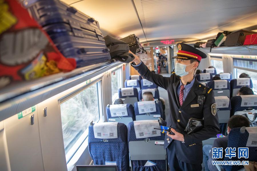 2月9日,在重慶北開往萬州北的C6422次列車上,付寶印在巡視車廂時為旅客調(diào)整行李架上的行李。新華社記者 黃偉 攝