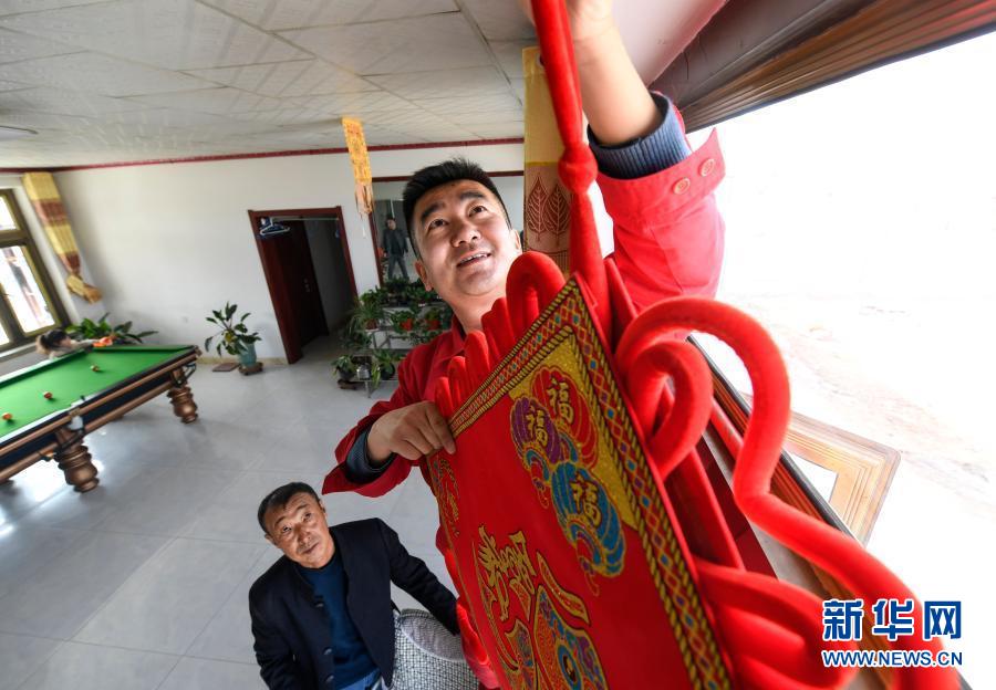 2月11日除夕當(dāng)天,王濤(右)在為脫貧戶劉玉強(qiáng)家掛中國(guó)結(jié)。