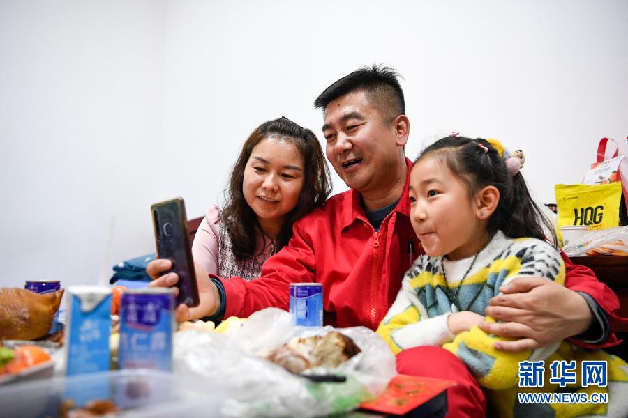 2月11日除夕夜,王濤(中)和妻子女兒在宿舍同在銀川的父母和2歲的兒子通視頻電話。