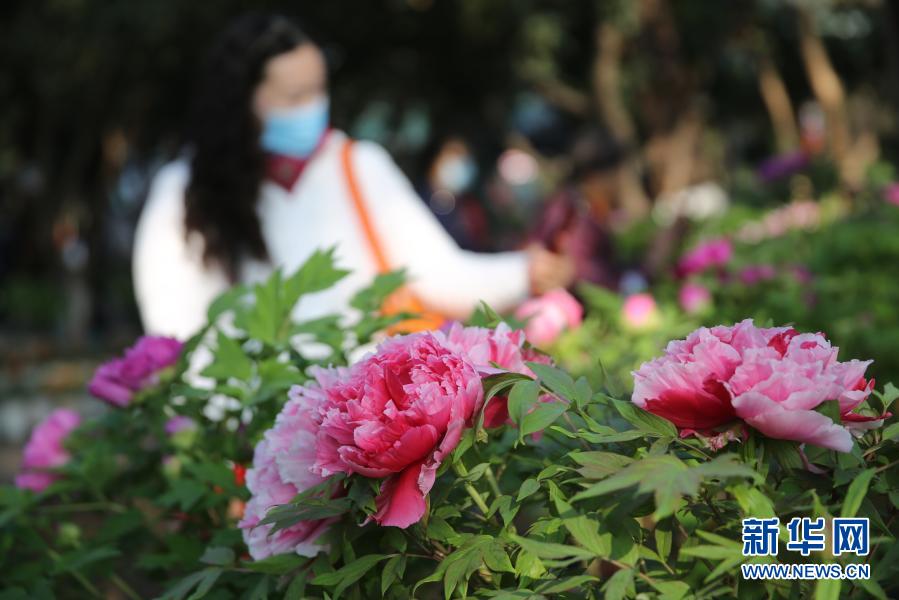 2月14日,游客在昆明市大觀公園觀賞盛開的牡丹。新華社發(fā)(梁志強 攝)