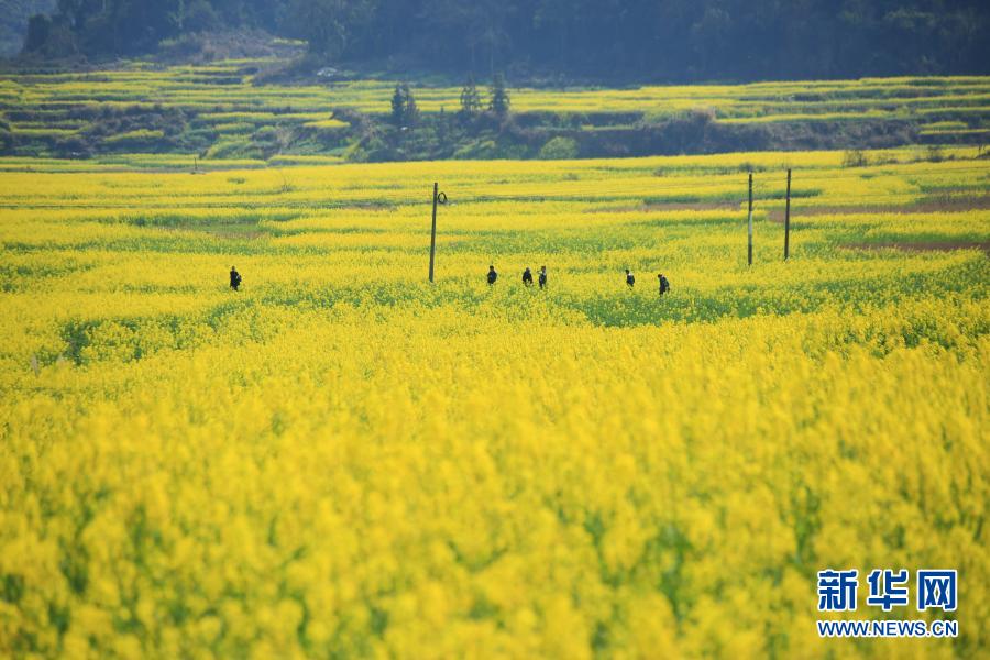 2月14日,在貴州省黔東南苗族侗族自治州黎平縣,游人在油菜花田賞花游玩。新華社發(fā)(徐基茂 攝)