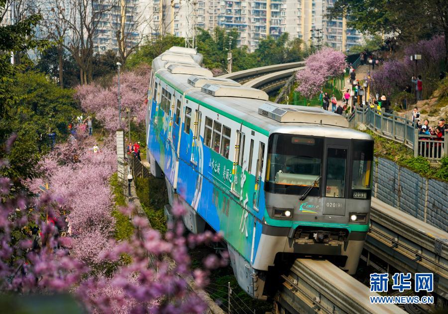 2月23日,在重慶軌道交通2號線佛圖關(guān)段,一列單軌列車穿越花海奔馳而過。