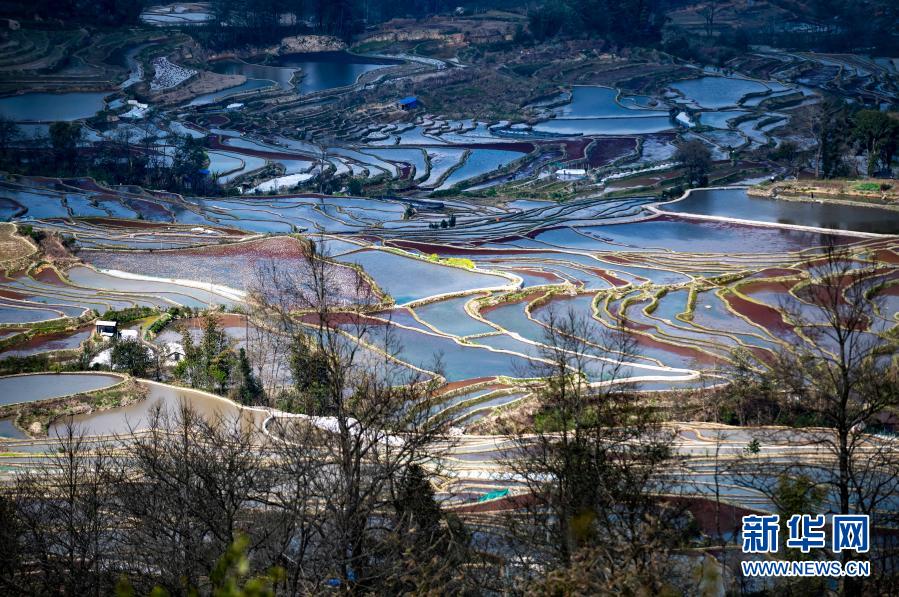春日里,位于云南省紅河哈尼族彝族自治州元陽縣境內的哈尼梯田在不同光照條件下呈現(xiàn)出豐富色彩,與周邊村寨、山系等和諧相融,猶如一幅幅色彩斑斕的油畫,美不勝收。
