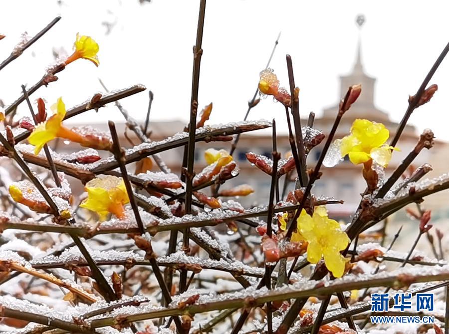 3月1日在北京中國(guó)人民革命軍事博物館附近拍攝的被冰雪覆蓋的迎春花。