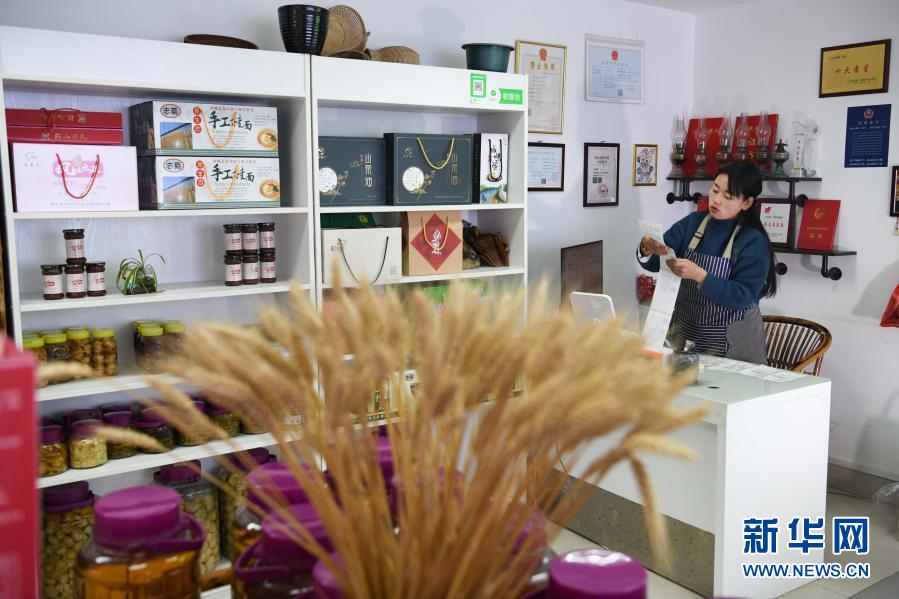 張志菊在自己的土特產(chǎn)店里打印快遞單(2月27日攝)。