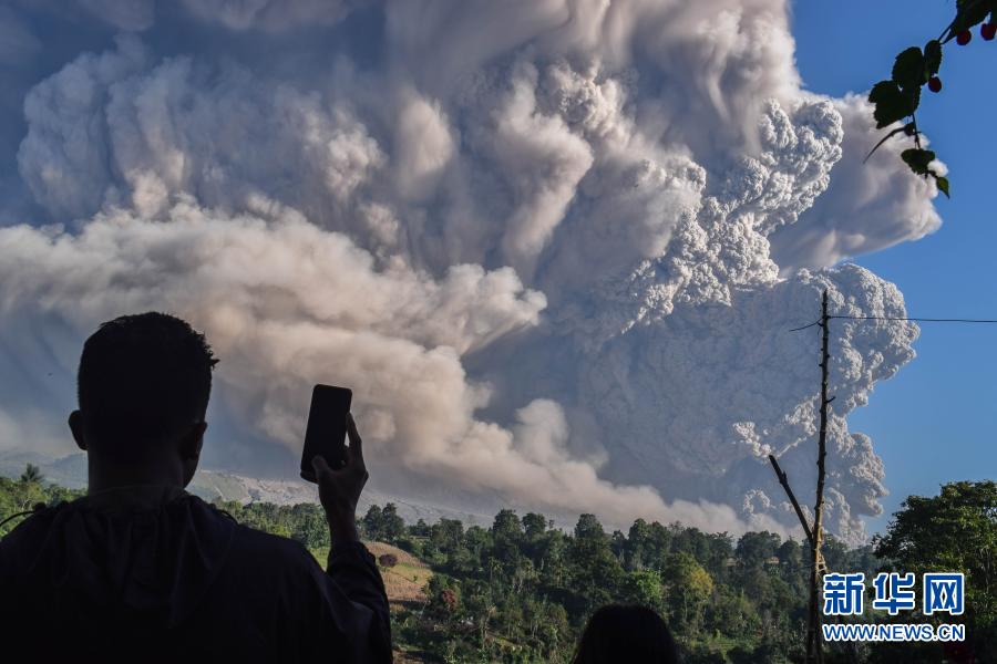 3月2日,一名男子在印度尼西亞北蘇門答臘省卡羅觀看噴發(fā)的錫納朋火山。新華社發(fā)(森比林?jǐn)z)