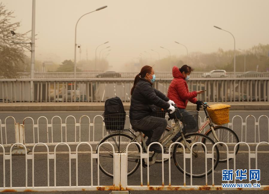 3月15日,市民騎車行駛在北京德勝門(mén)附近的道路上。當(dāng)日,我國(guó)北方多地出現(xiàn)沙塵天氣。新華社記者 賈浩成 攝