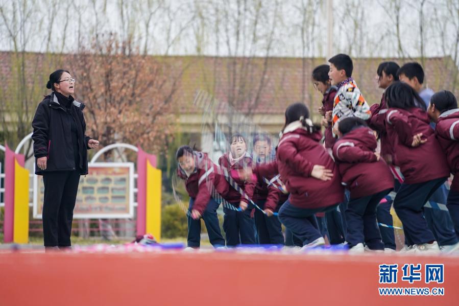 騎路小學(xué)劉彥老師(左一)指導(dǎo)同學(xué)們練習(xí)"大網(wǎng)繩跳"(3月9日攝)。新華社記者 李博 攝