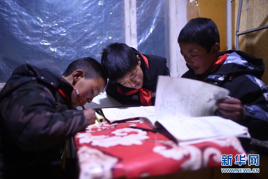 3月16日,在索加鄉(xiāng)寄宿小學,羅松東?。ㄖ校┖托』锇樵谒奚醿葴亓暪φn。新華社記者 張宏祥 攝