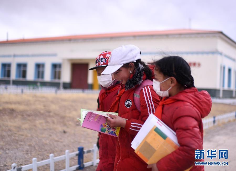 3月16日,在索加鄉(xiāng)寄宿小學,晚餐結(jié)束后,青梅才吉(中)和同學在校園內(nèi)。新華社記者 張宏祥 攝