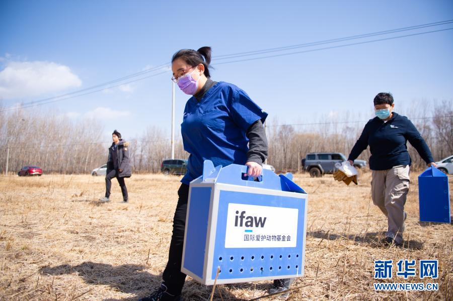3月20日,北京猛禽救助中心猛禽康復師戴暢(中)和周蕾(右)將裝有大鵟的猛禽運輸箱運至放飛場地。