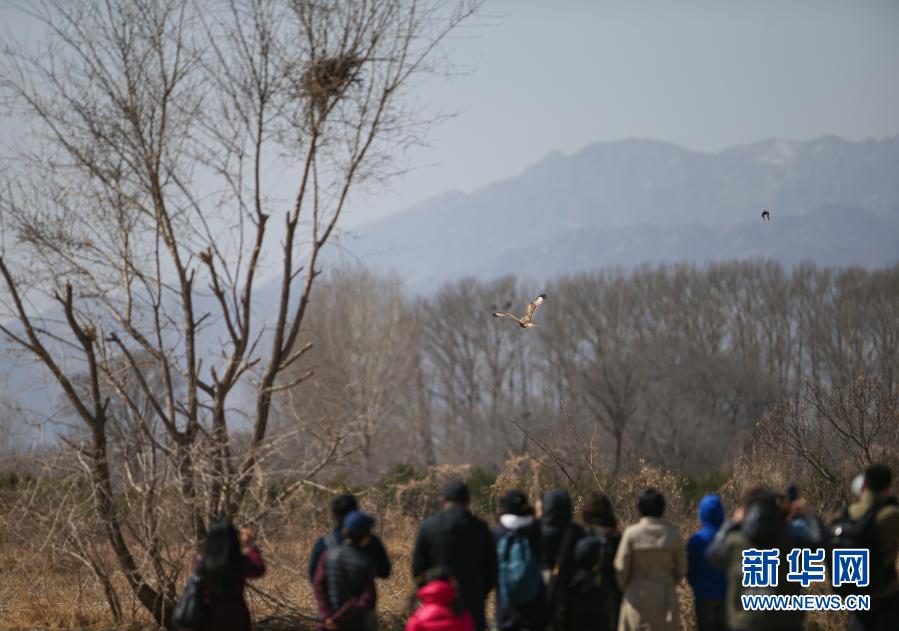 3月20日,參加放飛活動(dòng)的人員觀看大鵟飛翔。新華社記者 李京 攝