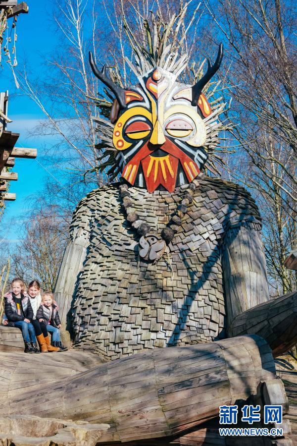 3月20日,孩子們?cè)诒壤麜r(shí)博姆市的德舒爾森林公園與“巨人”雕塑合影。新華社記者 張鋮 攝