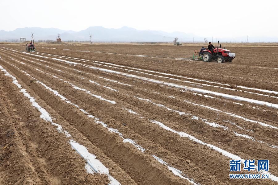 3月23日,工人操作機(jī)械設(shè)備在河北省張家口市萬(wàn)全區(qū)孔家莊鎮(zhèn)張杰莊村為剛播種的馬鈴薯覆膜。