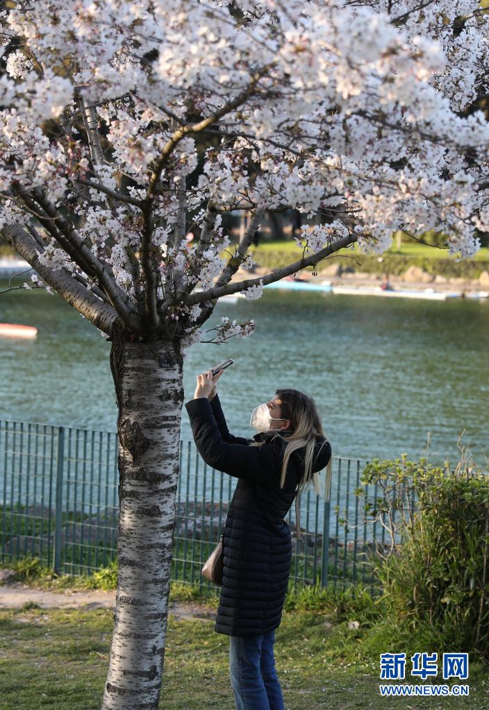 3月24日,佩戴口罩出行的市民在意大利首都羅馬一株盛開的櫻花樹下拍照。新華社記者 程婷婷 攝