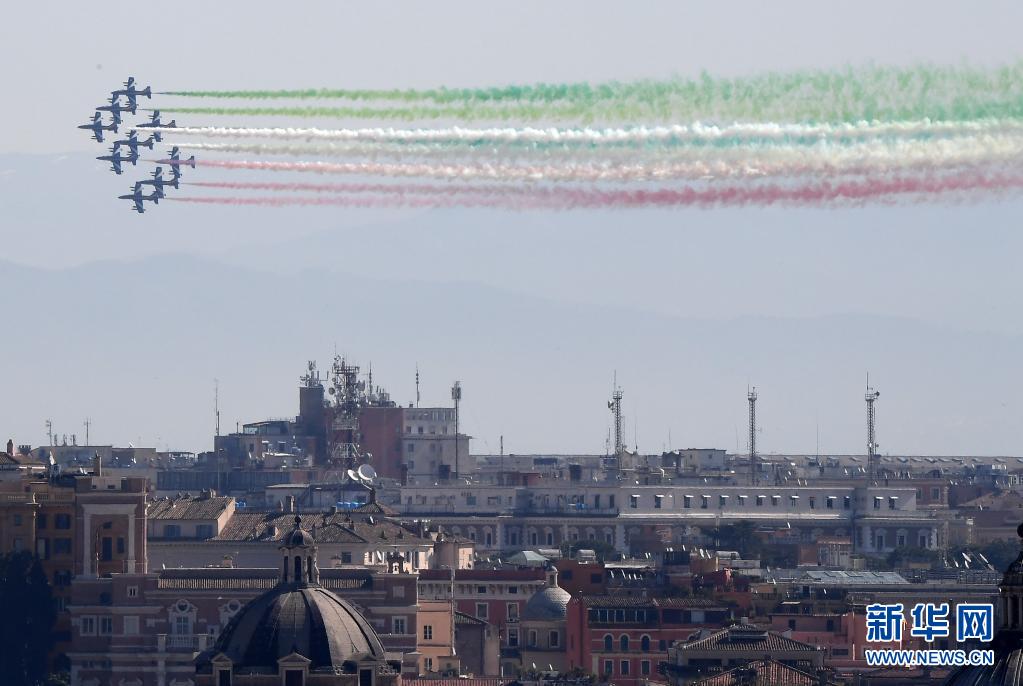 當(dāng)日,意大利“三色箭”飛行表演隊(duì)在意大利首都羅馬舉行飛行表演,慶祝意大利空軍建立98周年。