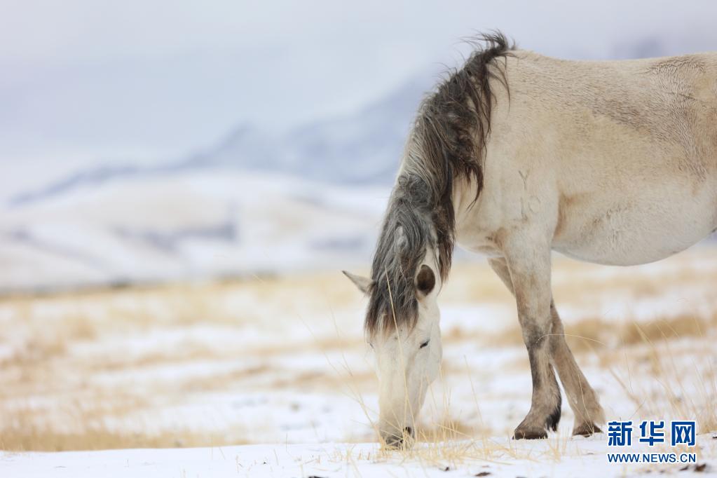 當(dāng)日,受冷空氣影響,位于甘肅省河西走廊中部、祁連山北麓的山丹馬場(chǎng)降雪,馬群在雪原上奔跑覓食,構(gòu)成了一幅壯美高原雪景 。