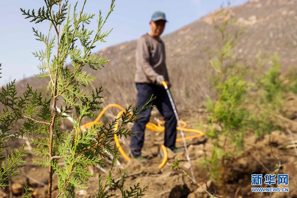 3月31日,造林隊(duì)員在河北省遵化市石門(mén)鎮(zhèn)金星山給新栽的樹(shù)苗澆水。
