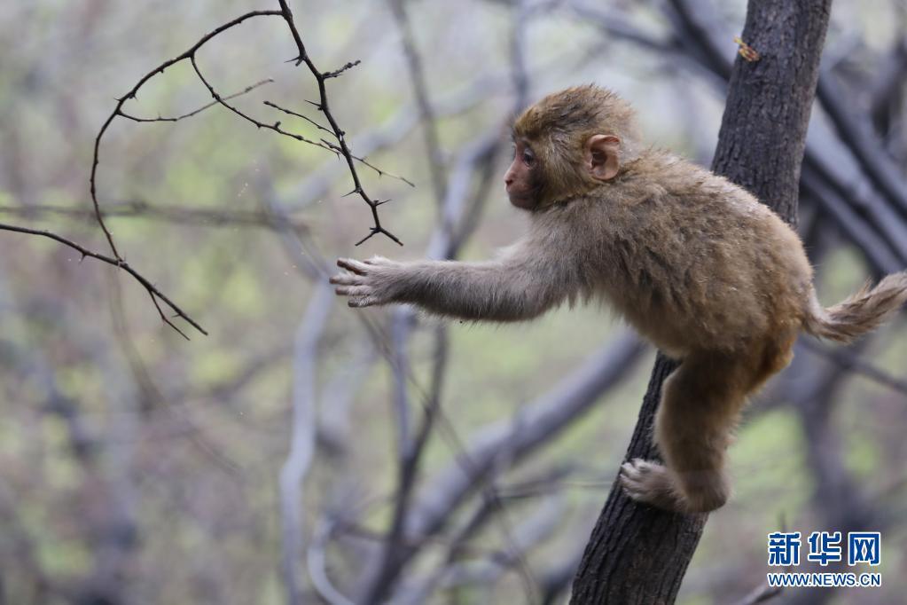 4月3日,在神農(nóng)山風(fēng)景區(qū),一只野生太行獼猴在樹上嬉戲。隨著氣溫回暖,河南省沁陽市神農(nóng)山風(fēng)景區(qū)野生太行獼猴活躍起來,在山林間嬉戲玩鬧,為景區(qū)增添生機和靈氣。新華社發(fā)(徐宏星 攝)