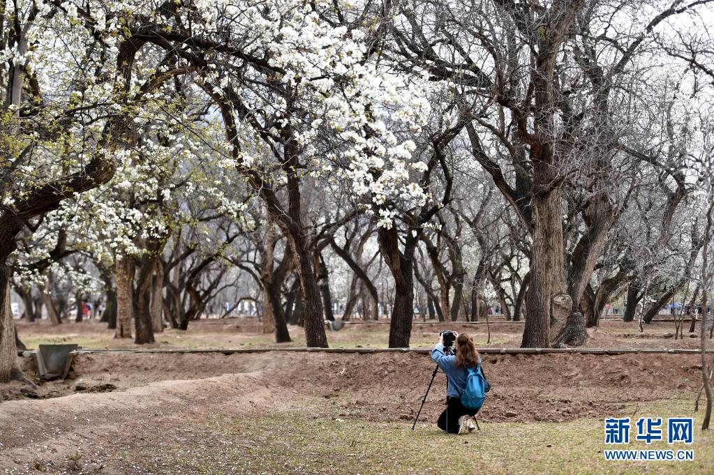 4月3日,游客在中衛(wèi)市南長灘村拍攝盛開的梨花。
