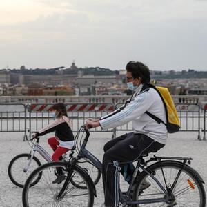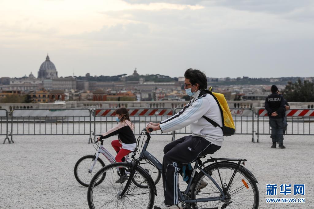 4月3日,人們騎車經(jīng)過意大利羅馬的蘋丘觀景臺。