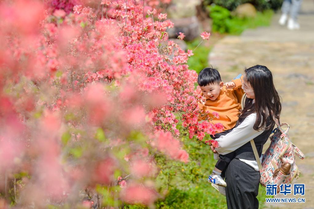 4月5日,一對(duì)母子在浙江省湖州市長(zhǎng)興縣和平鎮(zhèn)城山溝景區(qū)內(nèi)觀賞杜鵑花。