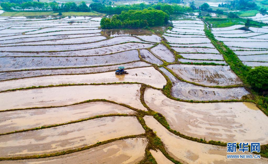 4月6日,江西省新余市仙女湖區(qū)鈐陽辦事處白田村農(nóng)民駕駛農(nóng)機(jī)耙田、施肥,為早稻插秧作準(zhǔn)備(無人機(jī)拍攝)。