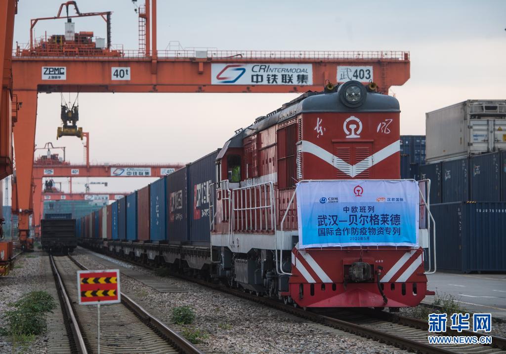 2020年5月9日,開往塞爾維亞貝爾格萊德的中歐班列(武漢)準備從吳家山站駛出,該班列滿載3500立方米、294.42噸國際合作防疫物資,支援塞爾維亞及周邊國家抗擊新冠肺炎疫情。新華社記者 肖藝九 攝