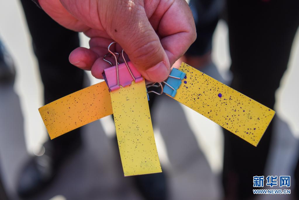 4月11日,在鐵門關(guān)市一處香梨示范園,技術(shù)人員檢驗(yàn)植保無人機(jī)花粉噴施效果。新華社記者 丁磊 攝