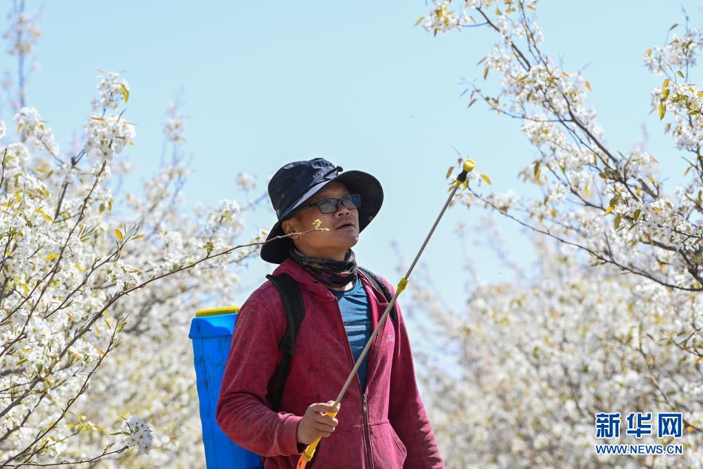 4月11日,在鐵門關(guān)市一處梨園,梨農(nóng)為梨花授粉。新華社記者 丁磊 攝