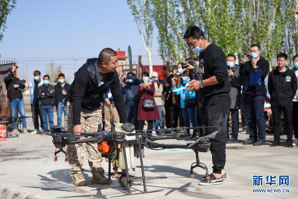 4月11日,在鐵門關(guān)市一處香梨示范園,技術(shù)人員調(diào)試植保無人機(jī)。新華社記者 丁磊 攝