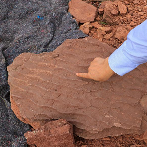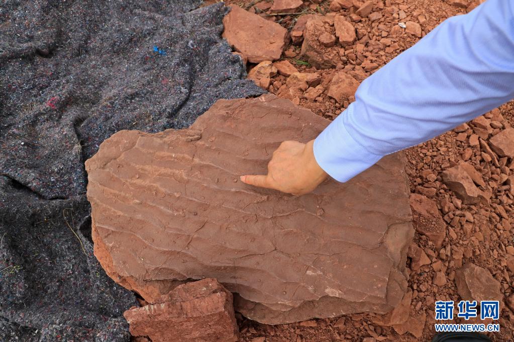 這是波痕沉積結(jié)構(gòu)化石和晚白堊世恐龍同時期的底棲生物潛穴化石(4月6日攝)。