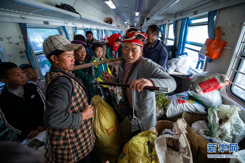 在5633次列車上的“流動(dòng)集市”,一名彝族婦女(前右)向其他乘客售賣山貨(4月11日攝)。新華社記者 沈伯韓 攝