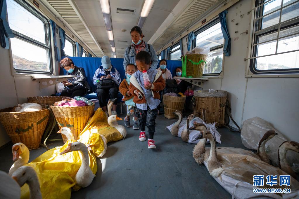 在5633次列車上,小朋友走過兩邊放著家禽的車廂(4月11日攝)。新華社記者 沈伯韓 攝