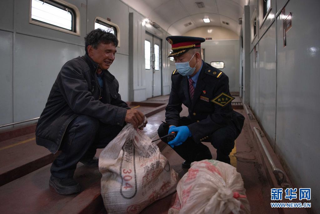 在5633次列車的“行李車廂”內(nèi),中國鐵路成都局集團(tuán)公司成都客運段5633/5634次列車長劉偉(右)了解村民攜帶牲畜情況(4月11日攝)。新華社記者 胥冰潔 攝