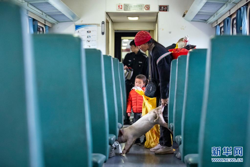 在5633次列車上,彝族乘客帶著的小豬從袋子里爬了出來(lái)(4月11日攝)。新華社記者 沈伯韓 攝