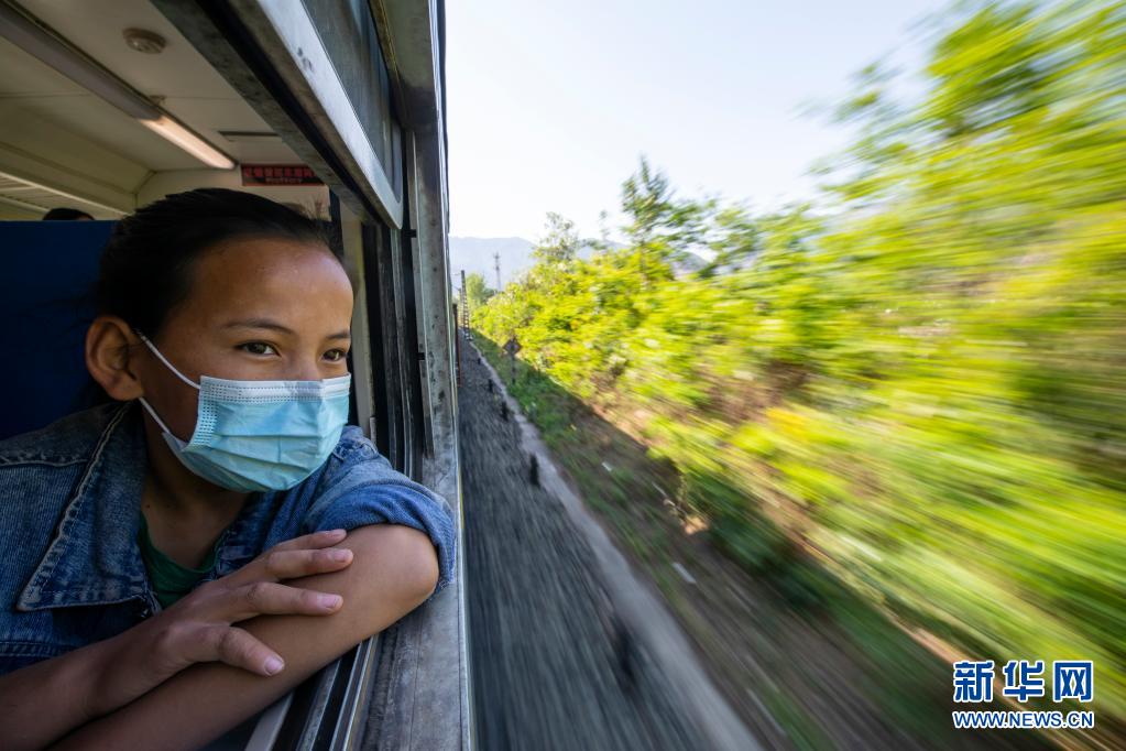 在乘坐5633次列車從家返校途中,一名學(xué)生望著窗外的風(fēng)景(4月11日攝)。新華社記者 沈伯韓 攝