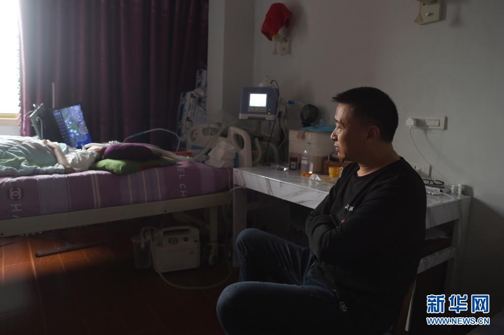 父親包宗鋒坐在床邊隨時“待命”(4月13日攝)。包宗鋒被檢查出腦血管畸形,因?yàn)橐湛春⒆樱恢辈桓胰プ鍪中g(shù)。