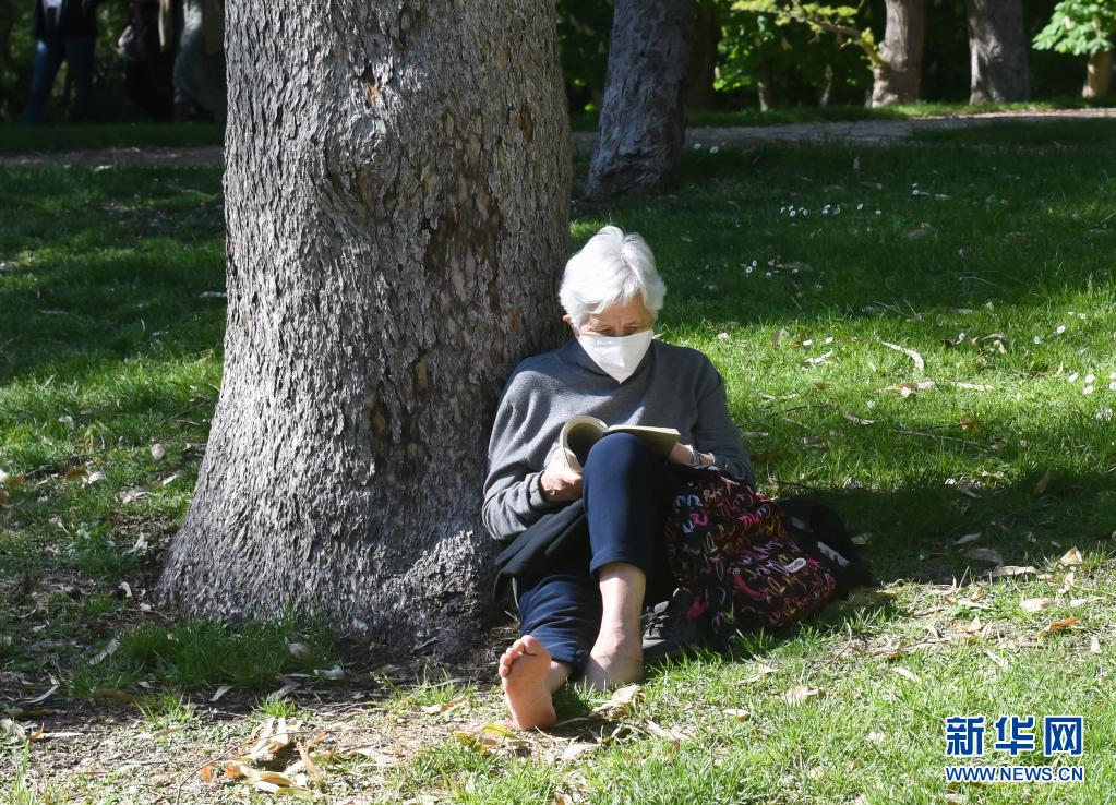 4月17日,一位老人在西班牙馬德里一個(gè)公園內(nèi)讀書(shū)。