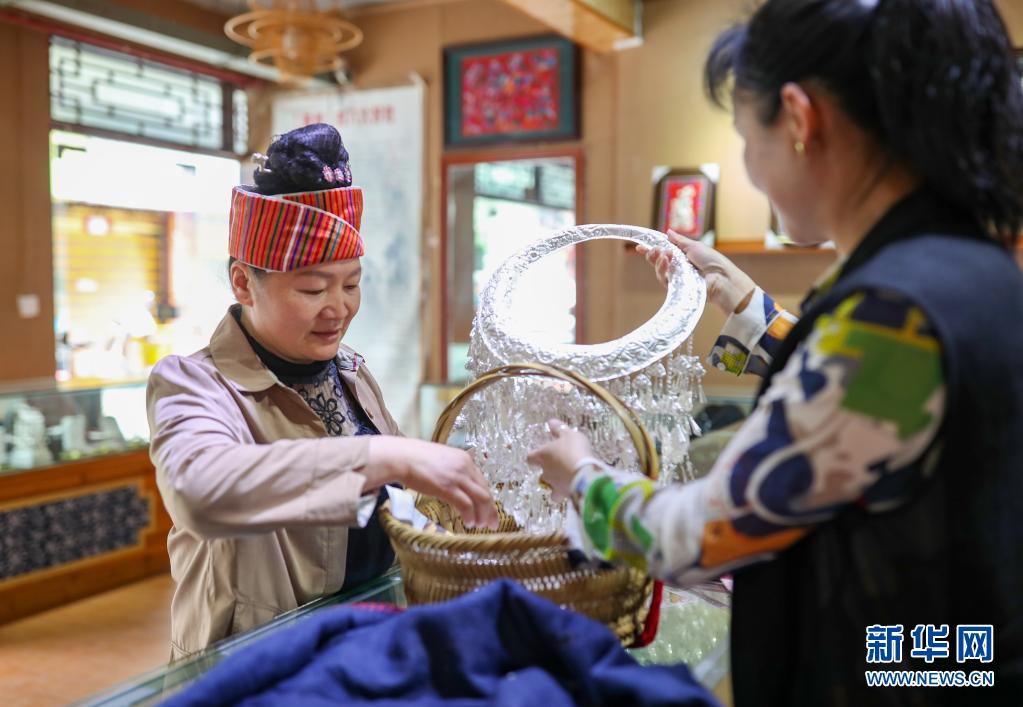 張佳麗的母親張?jiān)ⅲㄗ螅⒚缱迨⒀b的銀飾拿到銀飾店清洗(4月23日攝)。