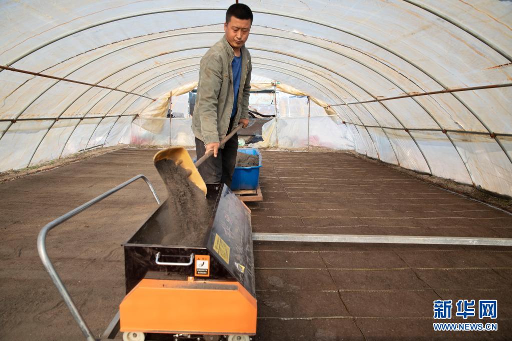 4月20日,在黑龍江省大慶市林甸縣東興鄉(xiāng)勤儉村,農(nóng)民許洪陽在進(jìn)行水稻育秧。新華社記者 張濤 攝