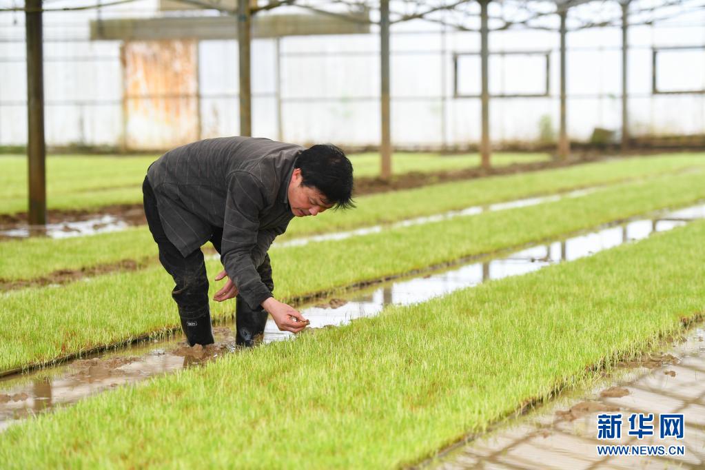 4月12日,在湖南省益陽(yáng)市赫山區(qū)歐江岔鎮(zhèn)牌口村,劉進(jìn)良在育秧棚里查看秧苗生長(zhǎng)情況。新華社記者 陳澤國(guó) 攝