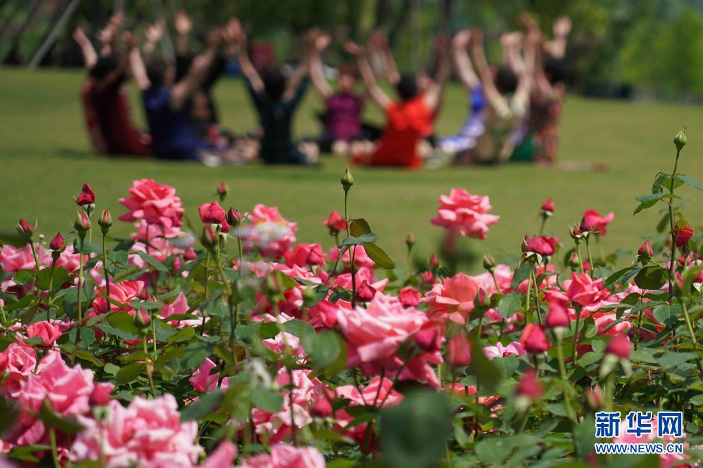 4月26日,市民在杭州濱江白馬湖公園月季園游玩賞花踏青并留影。近日,各地鮮花盛開(kāi),吸引人們走出家門踏青賞花。新華社發(fā)(莊穎昶 攝)